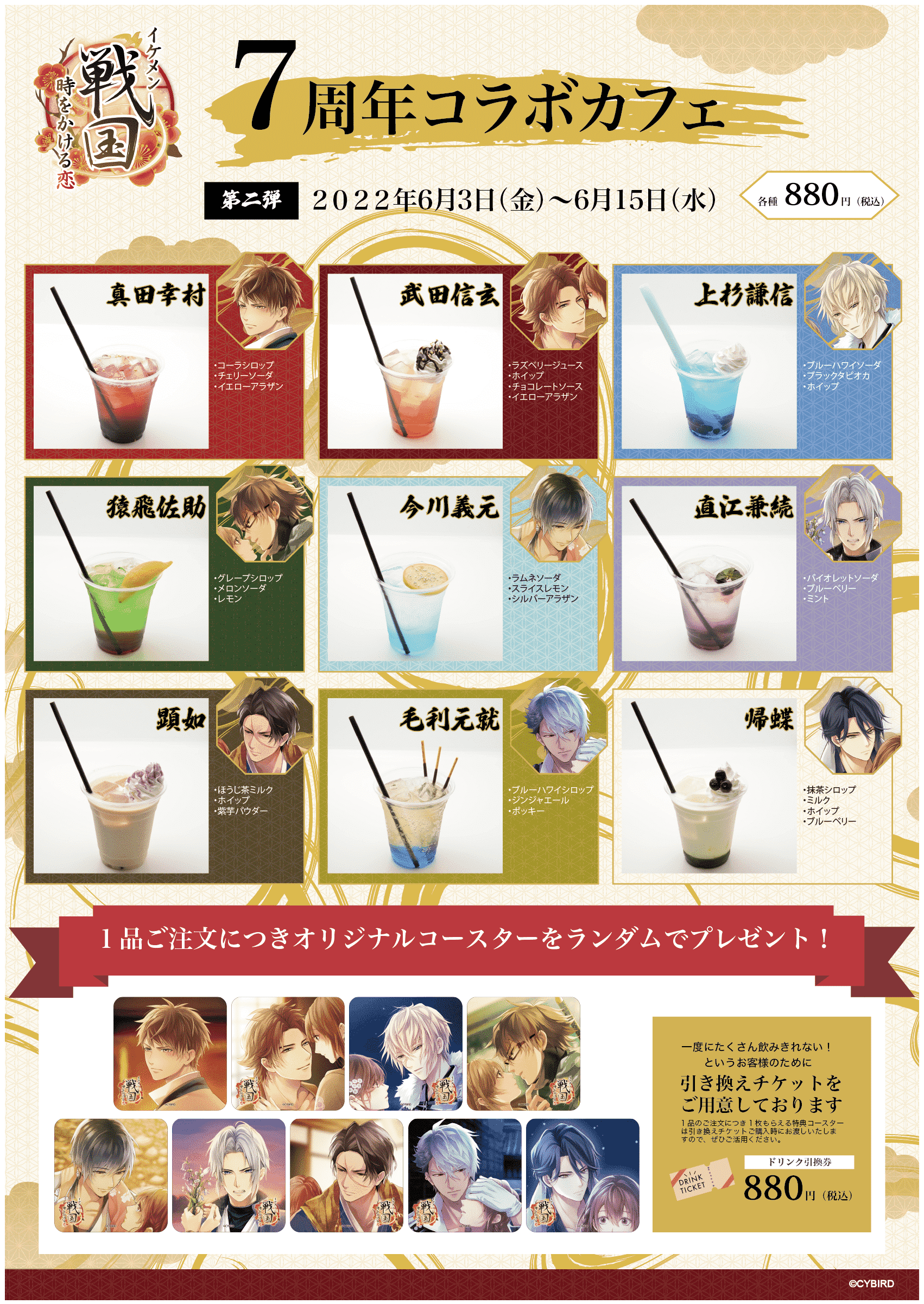 第二弾は6月3日(金)~6月15日(水)まで、『信玄・謙信軍、第三勢力」9人のコラボドリンクをお楽しみいただけます♪