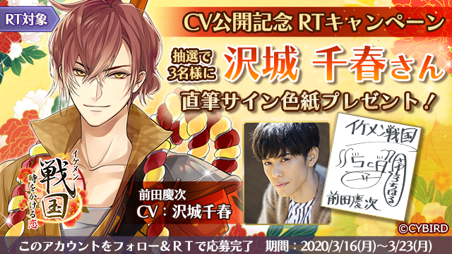 さらに、イケメン戦国公式Twitter(https://twitter.com/Cyikemensengoku)では、3月23日(月)まで「CV公開記念RTキャンペーン」を開催中。対象のツイートをリツイートした方の中から抽選で3名様に、前田慶次のCVを担当する沢城千春さんの直筆サイン色紙をプレゼントいたします。奮ってご参加ください!