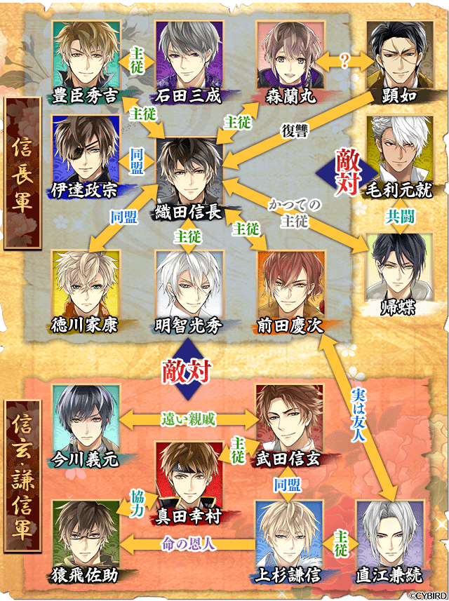第二幕から登場する前田慶次(CV:沢城 千春)や、帰蝶(CV:梶 裕貴)、直江兼続の新3武将も含め、全17武将が登場する第二幕プロローグ、及び、相関図を先行公開いたしました!