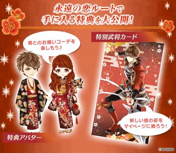 ①「永遠の恋」ルートのストーリーに新しい姿の彼が登場します。さらに!新しい姿の彼が武将カードとして手に入ります。あなたのために戦う新しい彼のイラストをストーリーとともにお楽しみください。