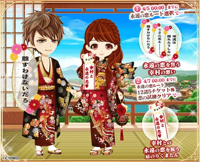 「永遠(とわ)の恋」(以下「永遠の恋」という)ルートを読むには、幸村との恋を進めて、「幸福な恋」と「情熱の恋」両ルートの13話まで読み終える必要があります。尚、すでに「幸福な恋」と「情熱の恋」両ルートをクリアされている場合も「永遠の恋」ルートの解放対象となります。