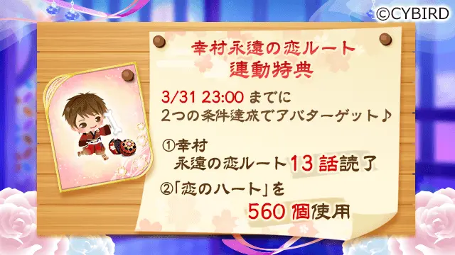 ③配信を記念して「幸村と永遠の恋♡応援キャンペーン」を4月7日(火)0時まで開催中。期日までに条件をクリアすると下記アバターをプレゼントいたします。