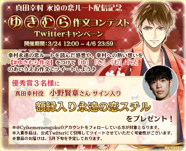 3月24日(火)12時から「ゆきむら作文コンテスト」Twitterキャンペーンを開催中。幸村への熱い想いを、【#ゆきむら作文】をつけて、「ゆ」「き」「む」「ら」のあいうえお作文にしてツイートしよう!優秀賞3名様には、真田幸村役 小野 賢章さんのサイン入り「額縁入り永遠の恋スチル」をプレゼントします。
