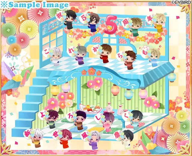 4種類のセットのうち、一番豪華な姫セットには、全17武将のボイスメッセージと五周年記念の城アバターが付いてきます。ボイスメッセージには、森蘭丸(CV:蒼井 翔太)、今川義元(CV:八代 拓)、毛利元就(CV:小西 克幸)、帰蝶(CV:梶 裕貴)、前田慶次(CV:沢城 千春)、直江兼続(CV:中川 晃教)が特典に初登場致します。武将たちの甘いメッセージをお楽しみに!また、同じく姫セットに付いてくる、五周年をお祝いする可愛いミニキャラや壁紙などの城アバターもお見逃しなく!