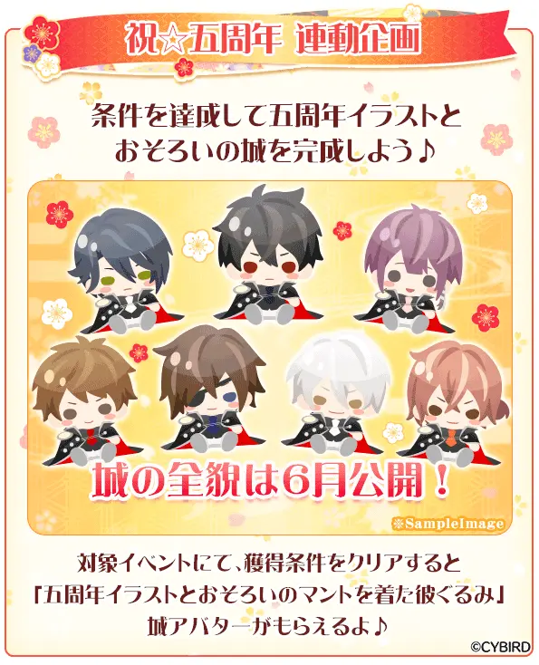 『イケメン戦国◆時をかける恋』のアプリ内において、5~6月に開催される対象イベントで条件をクリアすると、後日公開される五周年イラストとお揃いの城アバターをGETすることができます。お揃いのマントに身を包んだ可愛い彼ぐるみをお見逃しなく!連動企画の詳細は、後日アプリ内や公式Twitterでお知らせしますので、お楽しみに!さらに現在、五周年記念復刻姫がちゃも開催中です。詳細はアプリ内の五周年特設ページをご確認下さい。