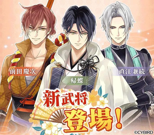 『イケメン戦国◆時をかける恋』第二幕の開幕に先駆け、第二幕から登場する新武将の「帰蝶(CV:梶 裕貴)」、「前田慶次(CV:沢城 千春)」、「直江兼続(CV:中川 晃教)」がアプリ内に登場しました。アプリ内では新武将紹介ストーリーを本日5月1日より公開中です。新武将との恋がここから始まるかも・・・?また、マイページに設定できる新武将たちの「武将カード」と姫部屋に新武将を呼べる「彼アバター」を追加しました。紹介ストーリーや武将カード、彼アバターはどなたでも楽しめるので、気になる新武将と過ごしてみてください。