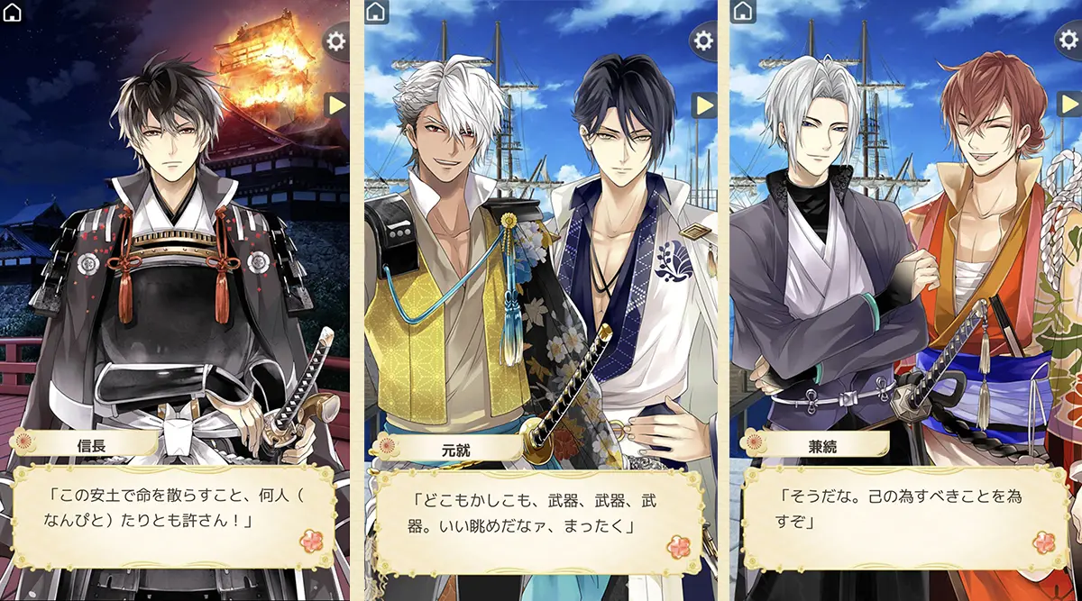 「織田信長」(CV:杉田 智和)、「伊達政宗」(CV:加藤 和樹)をはじめ、第二幕から登場する「帰蝶」(CV:梶 裕貴)、「前田慶次」(CV:沢城 千春)、「直江兼続」(CV:中川 晃教)といった総勢17名のキャストが演じる武将たちとの出逢いの物語を、フルボイスで何度でもお楽しみいただけます。