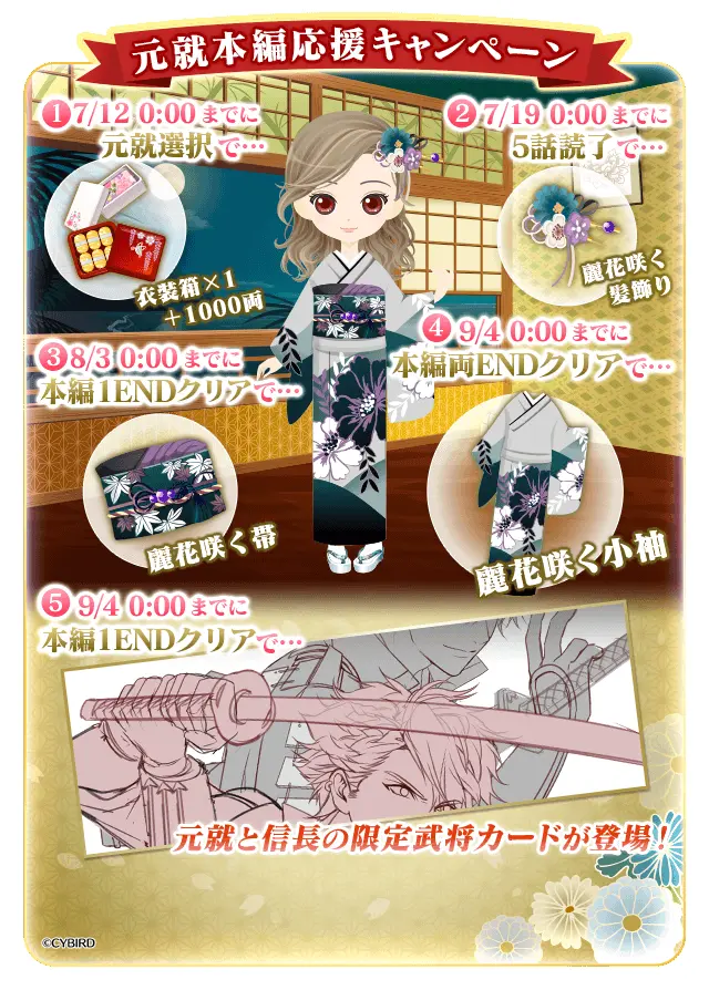 9月4日(金)0時までに「毛利元就」本編ストーリーを読み進めると、アプリ内で使えるアイテムや限定アバター、さらに「毛利元就」と「織田信長」の、描き下ろし武将カードが獲得できます。