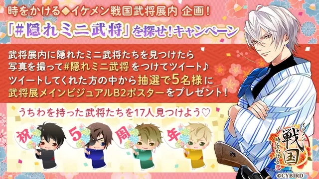 展示場内には、うちわを持った17人のミニ武将たちがこっそり隠れています。見つけたミニ武将の写真を撮って、「#隠れミニ武将」のハッシュタグをつけてツイートしてくださった方の中から抽選で5名様に、武将展メインビジュアルを使用したB2ポスターをプレゼントいたします。武将展に訪れた際は、ぜひミニ武将達を探してみてください。