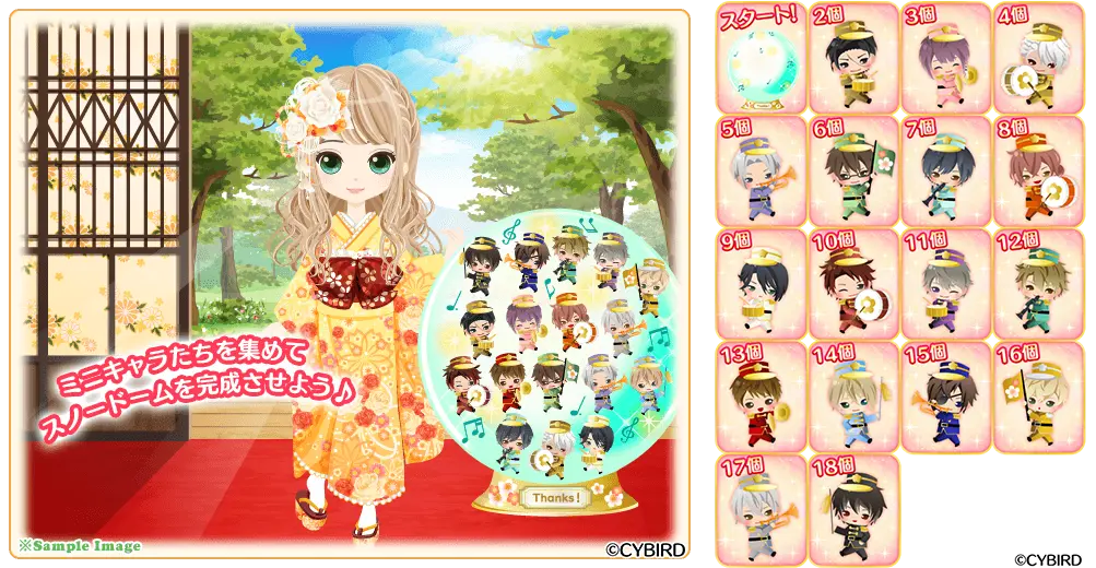 アプリへのログイン回数や、本編・続編の読了数に応じて、条件が達成されます。達成された条件の個数に応じて、スノードームの中を行進する可愛いマーチングバンドミニキャラ特典をプレゼントいたします。