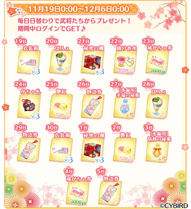 11月19日(木)より、最大4000円相当のアイテムが手に入る期間限定のログインボーナスを開始します。開催期間中、指定日にアプリにログインすると武将たちが登場し、彼らからアイテムをもらえます。17人の武将が毎日日替わりで登場するので、どうぞお見逃しなく!