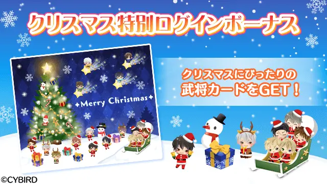 12月25日(金)にアプリにログインすると、クリスマス特別ログインボーナスとして、クリスマスにぴったりな可愛い武将カードをプレゼント。武将たちと素敵なクリスマスをお過ごしください。