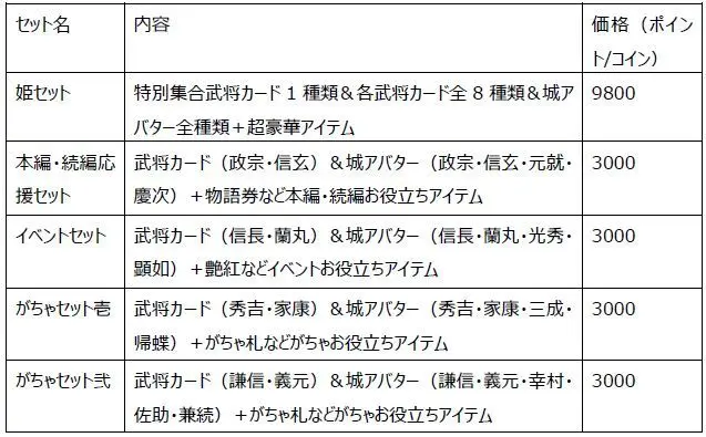 また、お手軽な「本編・続編応援セット」、「イベントセット」、「がちゃセット」も販売。それぞれのセットにも、武将カードや城アバター、お役立ちアイテムがたっぷり入っています。