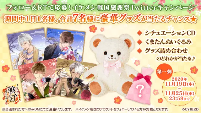 『イケメン戦国◆時をかける恋』公式Twitter(https://twitter.com/Cyikemensengoku)にて、豪華なグッズがあたるTwitterキャンペーンを開催! 第一弾は11月19日(木)~11月25日(水)、期間中一日1名様、合計で7名様に『イケメン戦国◆時をかける恋 シチュエーションCD ~伊達政宗編~ (CV.加藤和樹)』をはじめとするシチュエーションCDや、「くまたんぬいぐるみ」など豪華なグッズが当たるチャンスとなっています。