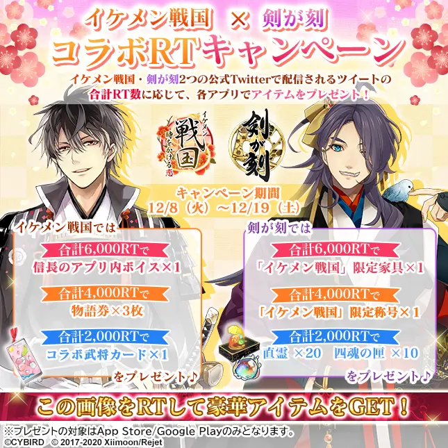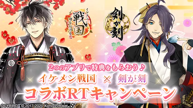 株式会社サイバード(本社:東京都渋谷区、代表取締役社長 兼 CEO 本島 匡、以下「サイバード」)の、全世界でのシリーズ累計会員数3,000万人を誇る女性向け恋愛ゲーム「イケメンシリーズ」の人気タイトル『イケメン戦国◆時をかける恋』は、Xiimoon株式会社とRejet株式会社が共同制作で手掛ける和風伝奇アドベンチャーRPG『剣が刻』とのTwitterコラボRTキャンペーンを、12月8日(火)より開催します。
