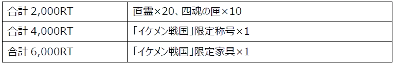 合計4,000RT達成特典は、『イケメン戦国◆時をかける恋』のタイトルとデザインが施された限定称号です。コラボならではのアイテムをお見逃しなく!