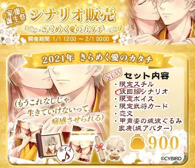 アプリ内では、1月31日(日)に誕生日を迎える「徳川家康」の、誕生日シナリオ販売『家康誕生祭~きらめく愛のカタチ~』を開催中です。シナリオ販売では、「徳川家康」との甘い誕生日ストーリーをお楽しみいただけます。今回初登場のセットに入った、甲冑を着た可愛らしい彼ぐるみアバターや限定スチルは必見です。