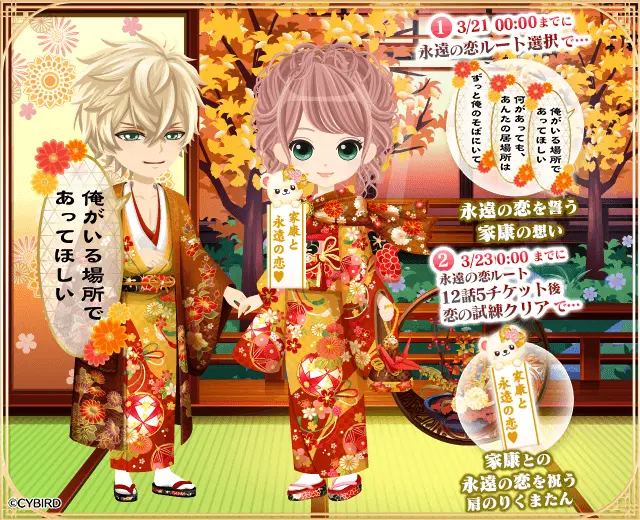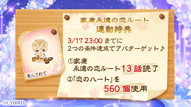 「永遠の恋」ルート配信を記念して、「家康と永遠の恋♡応援キャンペーン」を3月23日(火)0時まで開催中。期日内に条件をクリアすると上記の限定アバターをプレゼントします。