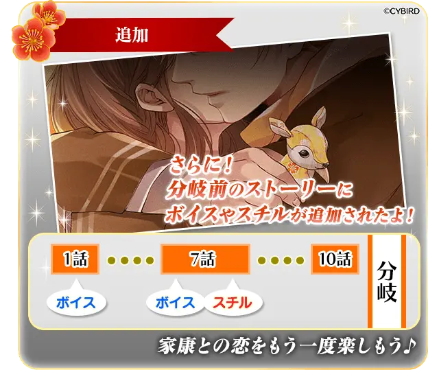 ・「徳川家康」本編の1話と7話のストーリーにボイスやスチルが追加されています。もう一度1話から「徳川家康」本編を読む方にもよりリッチにお楽しみいただけます。