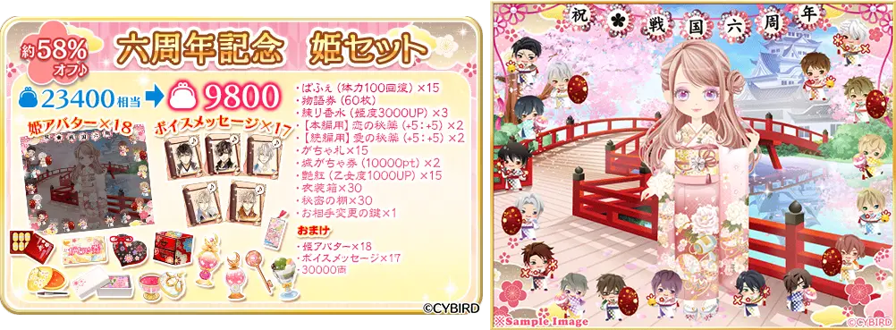 アプリを楽しむための、お役立ちアイテムが入ったセットを販売中です。体力回復アイテムや、ストーリーを読むことができる物語券が入った23,400円相当のセットが約58%オフとなっています。さらに、セットには全17武将のボイスメッセージと六周年仕様の姫アバターも含まれており、豪華な内容となっています。