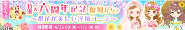 六周年記念復刻姫がちゃも開催します。過去の開催時に大人気だった洋風のコーデが復刻登場。3つの姫がちゃのアバターを一度に手に入れることができる豪華ながちゃとなっておりますので、こちらもお見逃しなく!