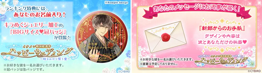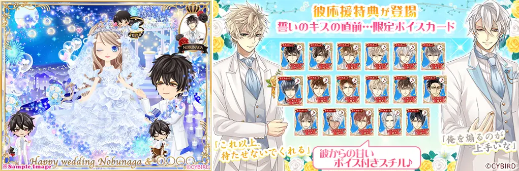 さらに、今回は彼応援ランキングに「あなたのお名前入りウェディング部屋飾りアバター」が初登場。彼応援ランキングは、彼への累計投票数に応じて決定します。ランキング特典以外にも、特典として、豪華なアバターやボイスカード(ボイス付きスチル)をご用意しております。