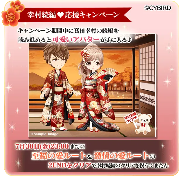 続編の配信を記念して「幸村続編♡応援キャンペーン」を7月30日(金)23時まで開催します。期日までに「至福の愛ルート」「激情の愛ルート」の両方をクリアすると、「幸村続編のクリアを祝うくまたん」アバターを獲得できます。