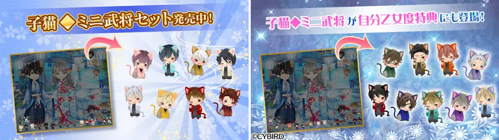 シナリオイベントでは、3武将のイベントストーリーが楽しめるほか、描き下ろしイラストを使用した武将カードが特典に登場します。さらに、全17武将が子猫になった可愛いミニ武将アバターアイテムがセット販売や特典に登場します。ぜひイベントにご参加ください。