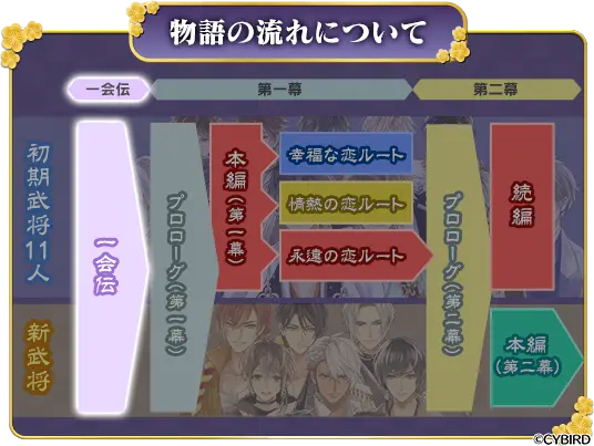 『イケメン戦国◆時をかける恋』の「一会伝(いちえでん)」は、武将たちがあなたに出会う前、「彼らが愛を知る前の物語」として、武将たちの「過去」にフォーカスしたストーリーです。第一幕プロローグ以前の物語となり、本編や続編の進行度に関わらず、どなたもお楽しみいただけます。