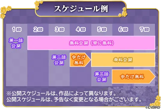 (例:10月13日16時に公開される第二話は、10月15日16時まで無料でお楽しみいただけます)