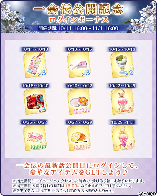 「一会伝(いちえでん)」の公開を記念して、「一会伝公開記念ログインボーナス」を開催中です! もらえるアイテムは最新話の公開タイミングと同時に切り替わります。最新話を無料で読みつつ、豪華なゲーム内アイテムが手に入るチャンスです。