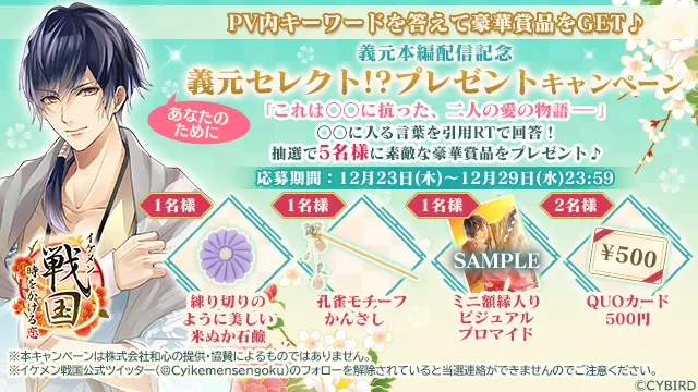 『イケメン戦国◆時をかける恋』公式Twitterでは、「今川義元」本編配信を記念した「義元セレクト⁉プレゼントキャンペーン」を、12月23日(木)~12月29日(水)23:59まで開催します。