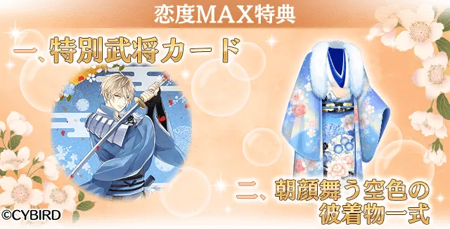 ①「永遠の恋」ルートのストーリーに新しい姿の彼が登場します。あなたのために戦う新しい彼のイラストをストーリーとともにお楽しみください。さらに! 「永遠の恋」ルートを進めると、新しい姿の彼が武将カードとして手に入るほか、アバターアイテムなど豪華な特典も手に入ります。