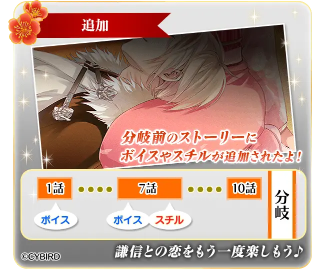 ・「上杉謙信」本編の1話と7話のストーリーにボイスやスチルが追加されています。もう一度1話から「上杉謙信」本編を読む方も、よりリッチにお楽しみいただけます。