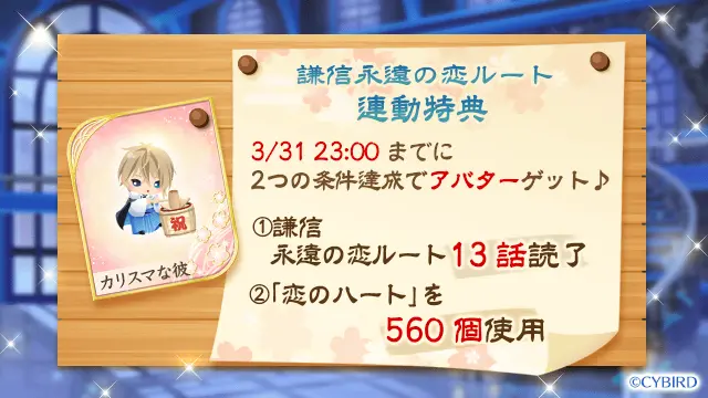 ②配信を記念して「謙信と永遠の恋♡応援キャンペーン」が、4月6日(水)0時まで開催中です。期日内に条件をクリアすると、上記の限定アバターアイテムをプレゼントします。