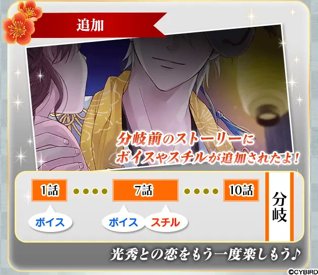 ・「明智光秀」本編の1話と7話のストーリーに新たにボイスやスチルが追加されています。もう一度1話から光秀本編を読む方にもよりリッチにお楽しみいただけます。