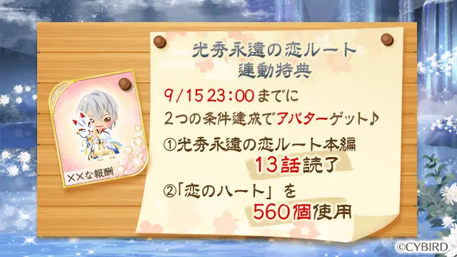 ②配信を記念して「光秀と永遠の恋♡応援キャンペーン」を2022年9月21日(水)0時まで開催中!期日内に条件をクリアすると下記の限定アバターアイテムをプレゼントします。