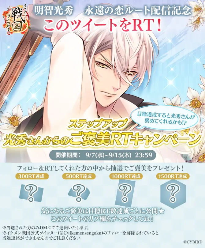 「明智光秀」の「永遠の恋」ルートの配信を記念して、『イケメン戦国◆時をかける恋』公式Twitterにて、「光秀さんからのご褒美RTキャンペーン」を開催中です。