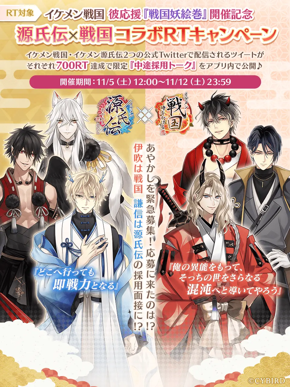 彼応援キャンペーン『戦国妖絵巻~彼が求める唯一の存在~』の開催を記念して、『源氏伝×戦国 コラボRTキャンペーン』を開催中。2つの公式Twitterで配信されるツイートがそれぞれ700RT達成で限定『中途採用トーク』をアプリ内で公開♪