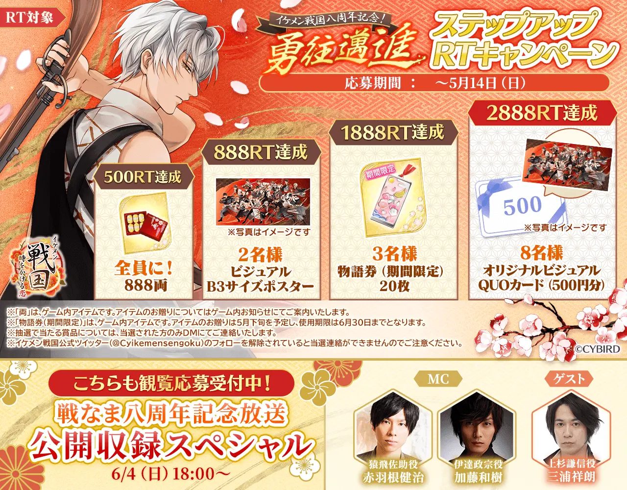 https://ikemen.cybird.ne.jp/title/sengoku/8th/■「戦なま」八周年記念放送決定&「勇往邁進ステップアップRT キャンペーン」開催!