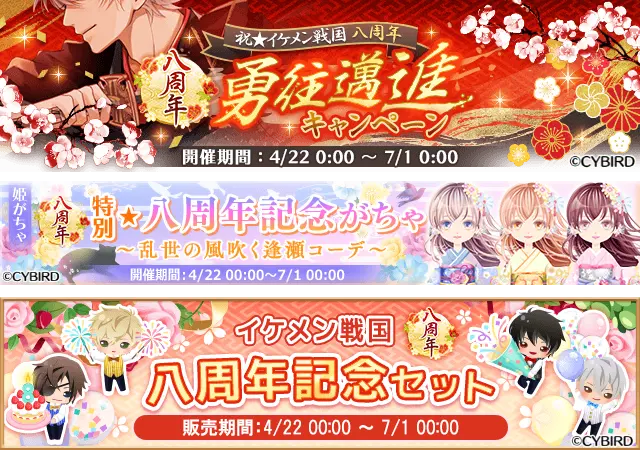 「祝☆イケメン戦国八周年 勇往邁進キャンペーン」では、条件クリアで「八周年記念のミニキャラ」を獲得できる企画や、「本編1話まるごと公開」などを実施しています。