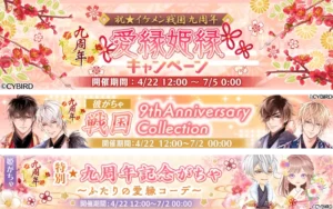 さらに、九周年の描き下ろしイラストを使用した武将カードが獲得できる彼がちゃ「戦国9thAnniversary Collection」や、九周年イラストと同じモチーフを使ったコーデが楽しめる姫がちゃ「特別☆九周年記念がちゃ~ふたりの愛縁コーデ~」も開催しています。