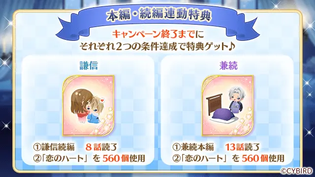 ■続編のポイント①続編では、「至福の愛ルート」「激情の愛ルート」「刹那の愛ルート」の3つのルートに分岐し、「至福の愛ルート」「激情の愛ルート」では、条件達成で極上のエンディングもお楽しみいただけます。さらに、もう一度同じお相手の続編を選択すると、続編の途中で彼目線の特別なストーリーもお読みいただけます。また、続編を読み進める中で登場する「ご褒美ストーリー」も、続編はリアクションボイス付きにバージョンアップしています。②続編を進めると、美麗スチルや彼とのお揃いコーデが楽しめるアバターアイテムなど豪華な特典が手に入ります。また、配信を記念して「謙信続編♡応援キャンペーン」を2024年11月18日(月)23時まで開催中です。期日までに条件を達成するとアバターアイテム「謙信続編のクリアを祝うくまたん」をプレゼントします。