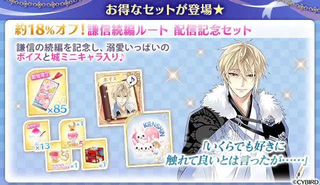 彼からの溺愛ボイスや、ペットのうさぎの「松竹梅」に寄り添う「上杉謙信」の特別な城ミニキャラなどが入った豪華セットになっています。本編・続編応援キャンペーン開催期間:2024年10月7日(月)12時00分~10月15日(火)23時00分
