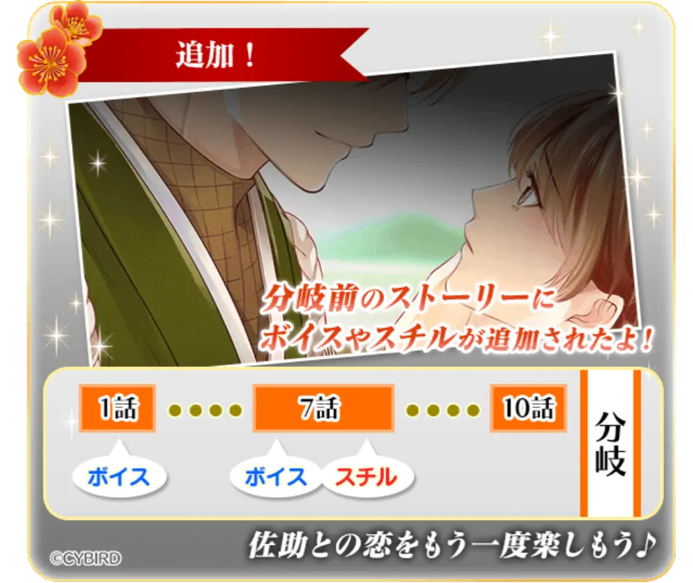 ・「猿飛佐助」本編の1話と7話のストーリーにボイスやスチルが追加されています。もう一度1話から本編を読む方にもよりリッチにお楽しみいただけます。