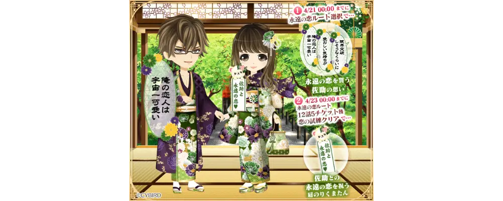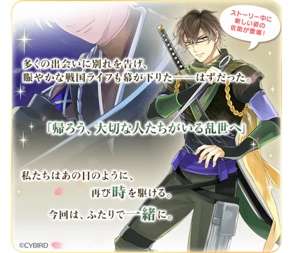 - 株式会社サイバード(本社:東京都品川区、代表取締役社長 兼 CEO 長嶋 貴之)が手掛ける、全世界でのシリーズ累計会員数4,000万人を誇る大人気恋愛ゲーム「イケメンシリーズ」の人気タイトル『イケメン戦国◆時をかける恋』(以下、『イケメン戦国』)は、2025年4月9日(水)12時より、「猿飛佐助(CV:赤羽根 健治)」(以下、「猿飛佐助」)の本編のさらなる恋物語「永遠(とわ)の恋」ルート(以下、「永遠の恋」ルート)の配信を開始しました。