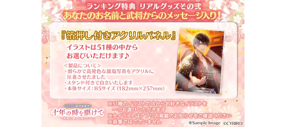 投票券の累計所持数に応じて、総合ランキングが決定します。上位になった方には、「あなたのお名前入り!選べる♥メッセージ付きアクリルパネル」や「彼からのお手紙」などをプレゼントします。