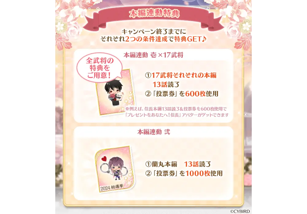 溢れるほどの愛で、あなたを満たすために――投票方法:本編・続編ストーリーを読み進めたり、ミニゲームをプレイすることで、「投票券」が獲得でき、推しの彼に投票することができます。また、投票を行うことで、豪華アバターアイテムや限定ストーリーが獲得できます。