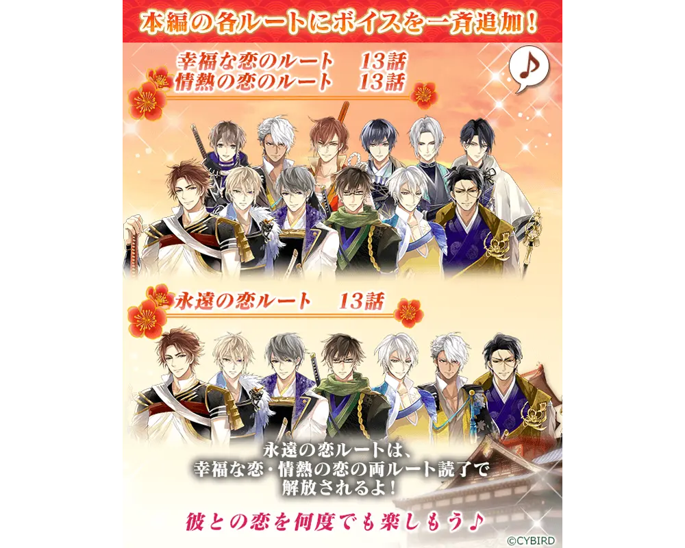 2025年6月23日(月)12時より、現在配信中の本編の「幸福な恋」ルート、「情熱の恋」ルート、「永遠の恋」ルートにボイスが追加されます。【「幸福な恋」ルート13話、「情熱の恋」ルート13話にボイスが追加される武将】