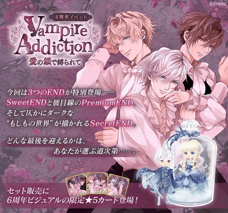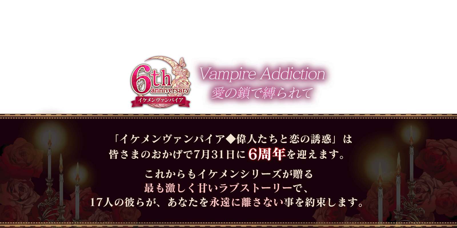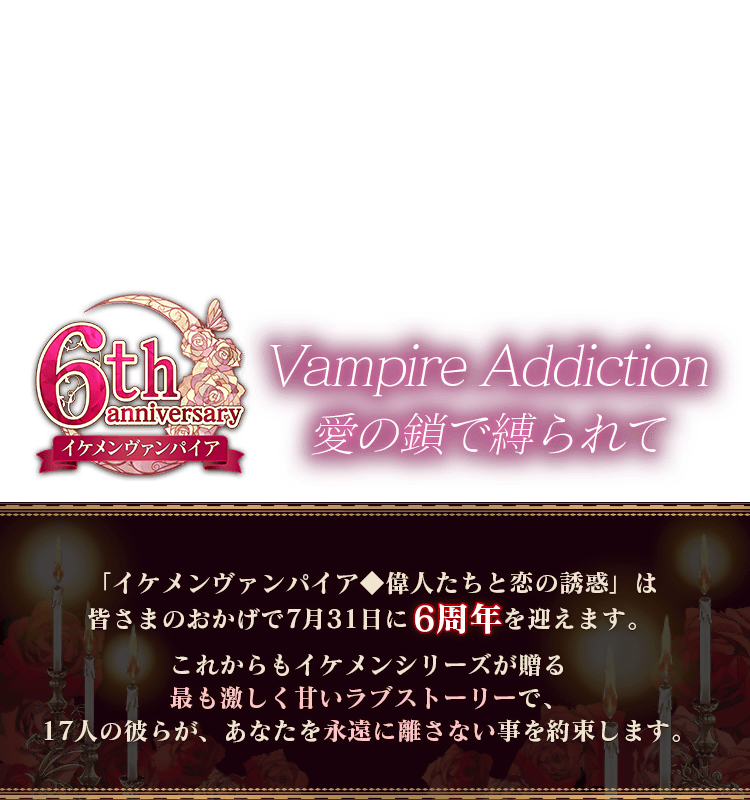 長きにわたってイケメンヴァンパイアを愛し続けてくださった皆様へ、これから先も彼らとの刺激的でかけがえのない時間をお届けする為に、6周年を節目に物語は新たな展開を迎え、イケメンヴァンパイアはさらに進化します。